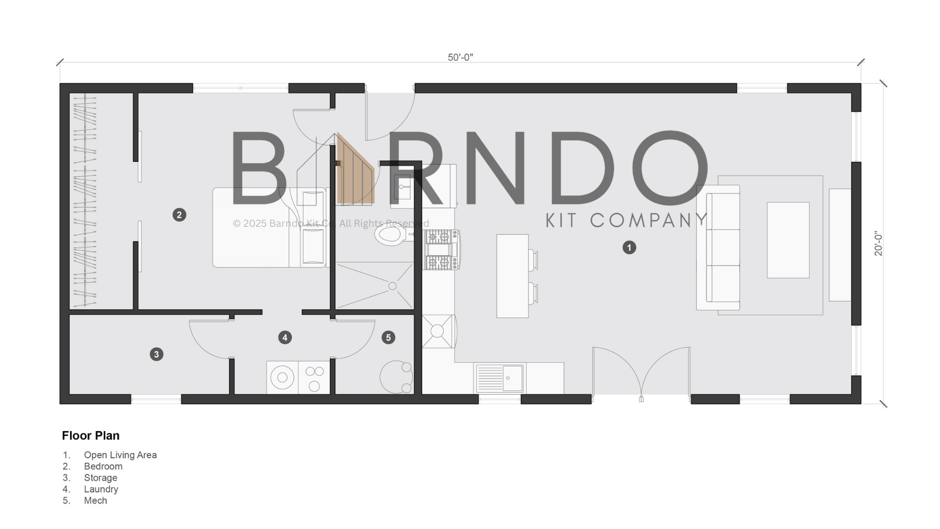 This 20×50 barn home kit is built for efficient living in a compact footprint. Inside, you’ll find a generous open living area, a full kitchen, and dedicated laundry, storage, and mechanical spaces that keep the main areas organized. One spacious bedroom and one bathroom offer comfortable accommodations for individuals or couples looking for a functional home base. The simple exterior lines make this barn home an easy fit on almost any property, with the flexibility to adapt to your style and needs.